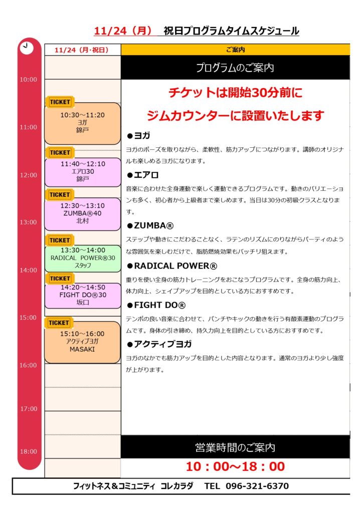 11月24日(月)祝日のレッスンスケジュールになります。下記をご覧いただければと思います。