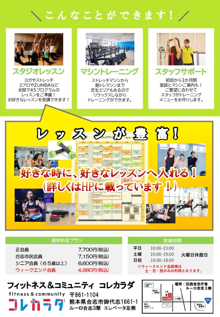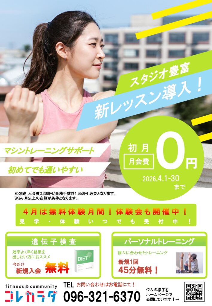 また4月は「体験無料月間」になりますので、通常1,000円体験料を頂くところを、入会をご検討している方限定で1回無料でお使いいただけます。